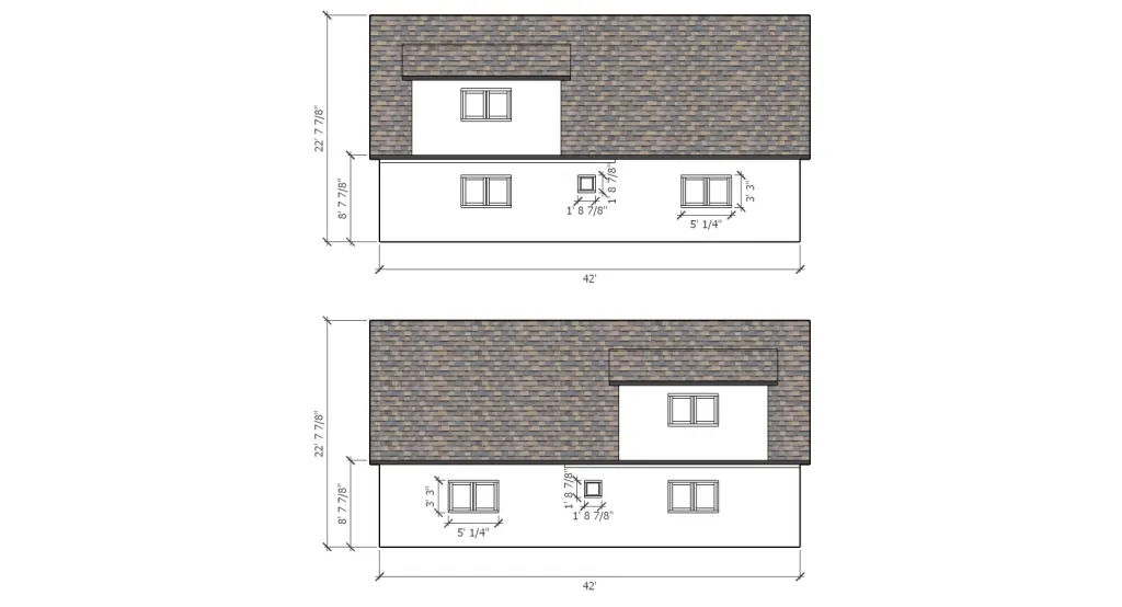 Hillside Lofted is an example of a model using our method of dormers. This 4 bedroom 2 bathroom two story model has vaulted/cathedral ceilings. The stairs lead to an open interior deck area overlooking the main living room. Cann be assembled by 3 people in 10 days or less
